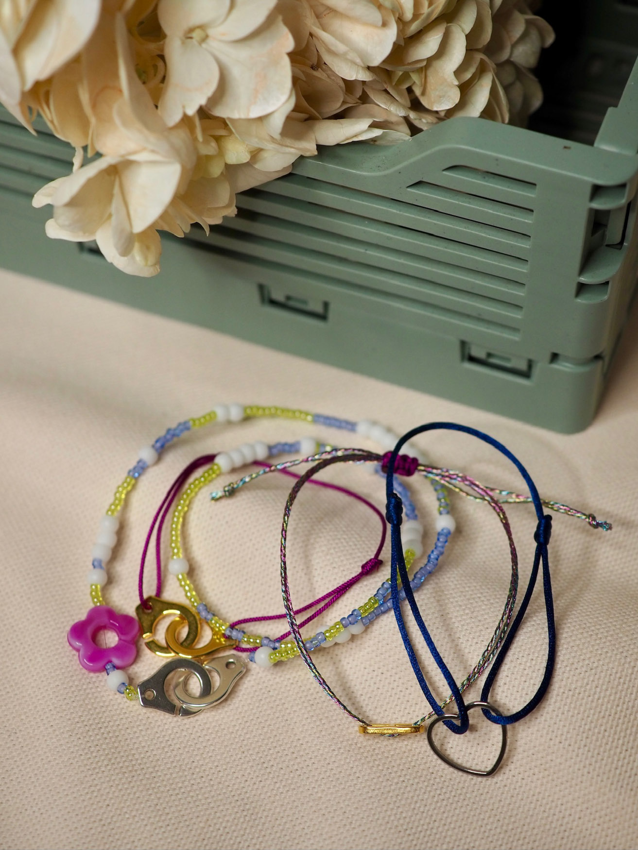 Le mélange des perles de rocaille (bleues, blanches, vertes) donne un rendu super frais. On adore la petite fleur acrylique fuchsia qui apporte une touche pimpante. Les menottes dorées ou argentées, quant à elles, sont les intemporelles du moment. Et le connecteur maillon permet de créer une pièce plus affirmée, à la fois bijou et accessoire.